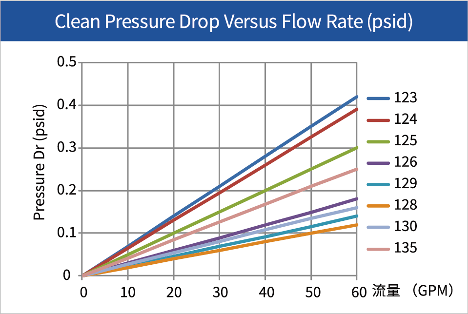 .容雜量:以上數據為各個不同粒徑雜質的容雜量。容雜量數據是量測過濾後殘留在濾袋內的雜質淨重,其測試是在建議流量內的水中矽粉含量,測試壓力在35psid(2.4bar)。